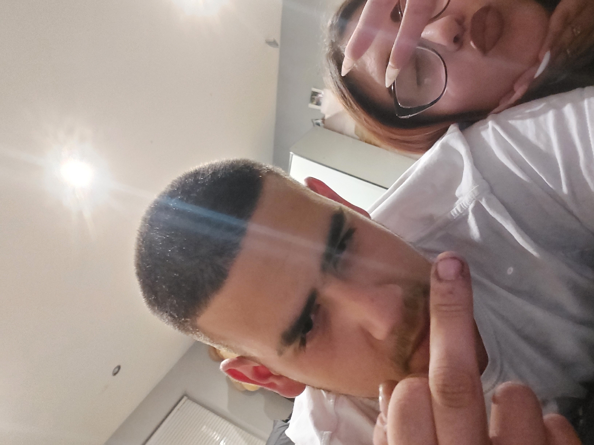 The image depicts two individuals in an indoor setting. A man with short, dark hair is in the foreground, partially obscured by his raised middle finger. A woman wearing glasses is visible behind him. Both are wearing white shirts. The background includes a white ceiling with lights and a white cabinet. The location in Kostenets, Bulgaria, cannot be determined from the visual information provided.