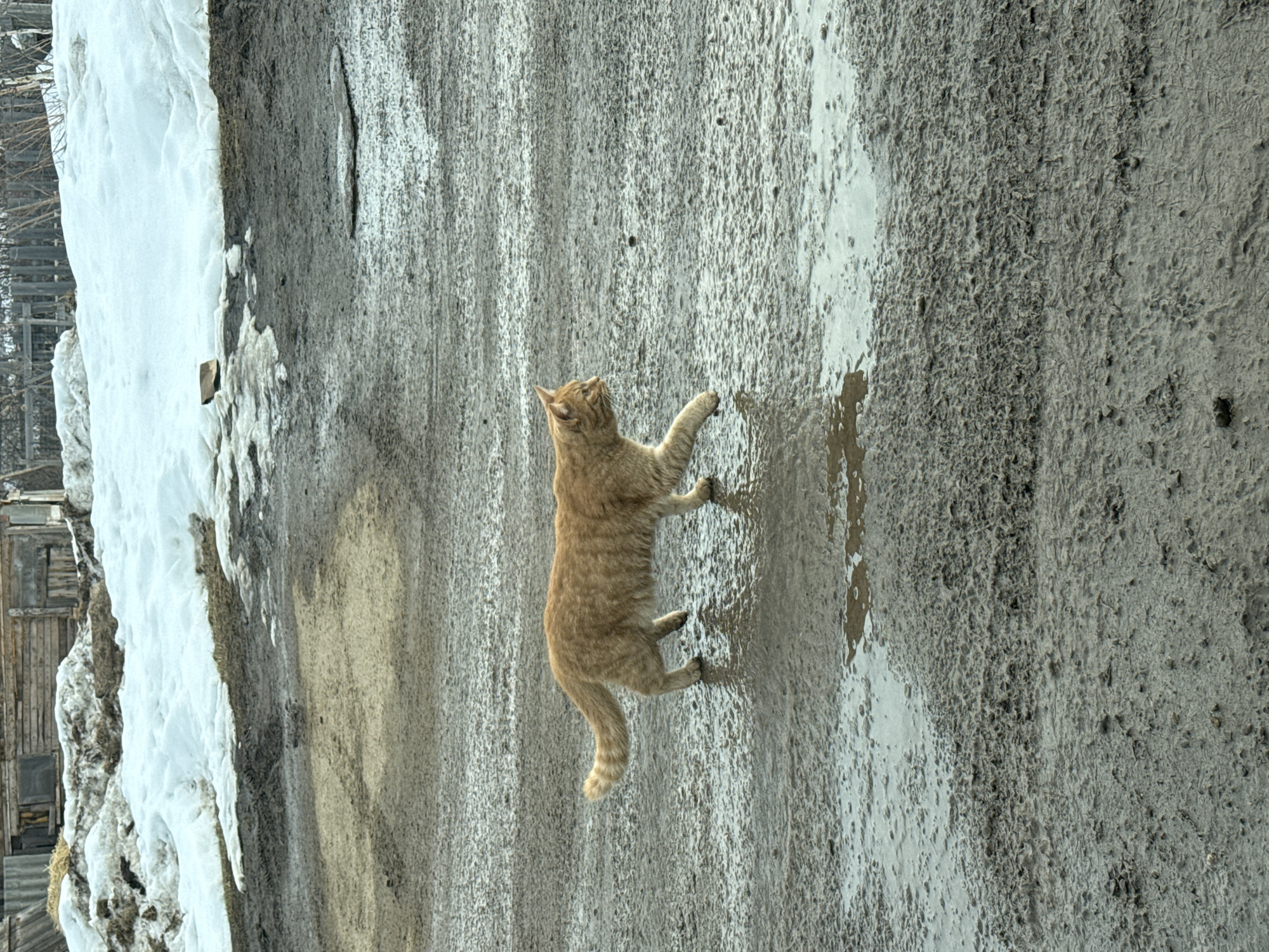 An orange cat is standing in a puddle on a dirt road in Elovo, Russia. Snow is piled up on the side of the road. In the distance, a wooden building is visible.