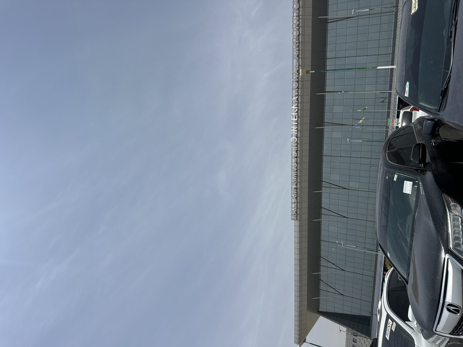 The scene depicts the exterior of Mallam Aminu Kano International Airport, located in Aviation Quarters, Nigeria. The upper two-thirds of the image show a pale blue sky with faint, wispy cloud formations. The prominent subject is the airport terminal building, a modern, multi-story structure with a reflective glass facade and a light-colored, flat overhang/roofline. The name "MALLAM AMINU KANO INTERNATIONAL AIRPORT" is displayed in large, silver or white, three-dimensional letters across the upper section of the building's facade, beneath the overhang. In front of the building, three flagpoles are visible; two are actively displaying flags, one exhibiting green and white stripes, the other blue and yellow. In the foreground, a parking lot occupies the lower third of the image, filled with multiple vehicles that partially obscure the base of the airport building. A dark-colored SUV, identifiable as an Acura by its grille and headlight design, is centrally positioned, facing the viewer. Its windshield bears a white sticker with the partial inscription "NGL 00". To its immediate left, a portion of a white SUV is visible. To the right of the Acura SUV, the front portion of another dark-colored sedan is present, also with a sticker on its windshield. No individuals are visible, and no actions or interactions are occurring. The environment suggests clear daylight conditions.