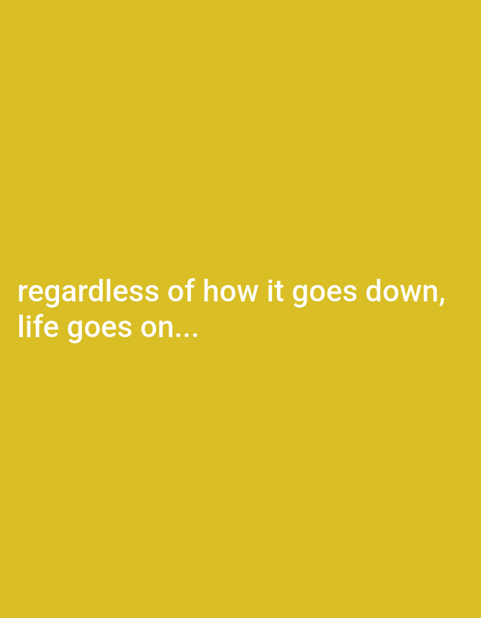 The scene is located in the city of Unknown, Unknown. The image displays a solid mustard yellow background. Centered on this background, in white, sans-serif text, is the phrase: "regardless of how it goes down, life goes on...". No individuals, physical objects, actions, or interactions are depicted. The environment is a digital display of text against a monochromatic background.