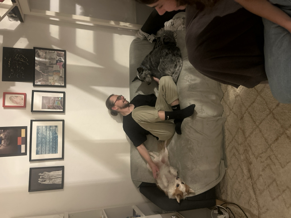 A man sits on a grey sofa with two dogs. One is a blue heeler that sits near his legs. The other dog, a fluffy white and tan one, is lying on its back and being petted by the man. Another person sits to the right. On the wall are several framed pictures. The floor is covered in a tan rug.