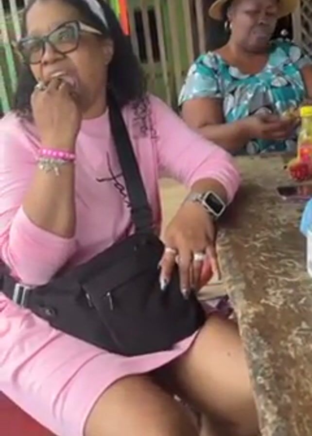 Two women are seated at a weathered, wooden table in an outdoor setting. The woman in the foreground is wearing a light pink dress, glasses, and a black fanny pack. She has several rings on her fingers and an Apple watch on her left wrist. She is holding a reddish, exotic-looking fruit in her right hand and appears to be eating it. The other woman, seated further back, wears a patterned blouse and a straw hat. She is also holding something in her hand, possibly food. The table has bottles of juice, a mobile phone, and a bottle of hand sanitizer on it. The background features what seems to be a rustic structure made of wood. There are red, green, and yellow decorative streamers hanging from the structure.