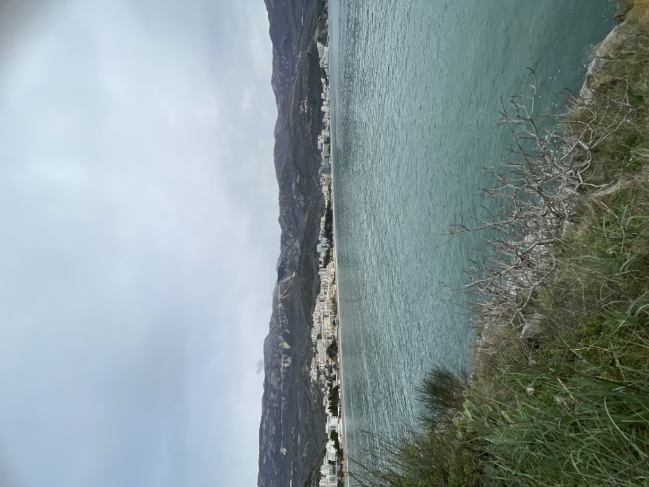 The image depicts a panoramic view of the coastal city of Budva, Montenegro, observed from an elevated position looking across a body of water. The foreground displays a rocky embankment covered with green grass and several dry, leafless shrubs. The midground features a calm, turquoise-hued sea with minor surface ripples. Across the water, the city of Budva stretches along the coastline, characterized by a dense concentration of white and light-colored multi-story buildings, appearing to be residential or hotel structures, situated directly behind a visible beach strip. In the background, a range of dark, rugged mountains, sparsely vegetated, rises behind the urban area. The sky is uniformly overcast and light grey, covering the upper half of the scene. No individuals or active interactions are visible.