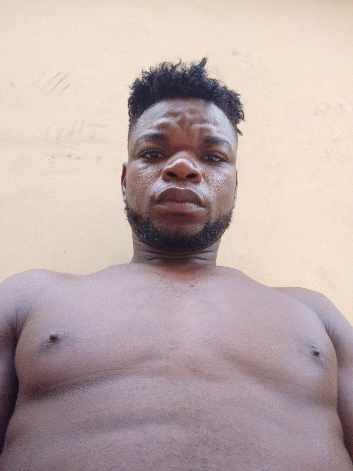 A shirtless man with short, dark, curly hair and a beard poses for a low-angle selfie against a plain, light orange background. His dark eyes and strong facial features are prominent. His chest and shoulders are visible, showing some muscle definition. The lighting is somewhat uneven, creating shadows and highlights on his skin.
