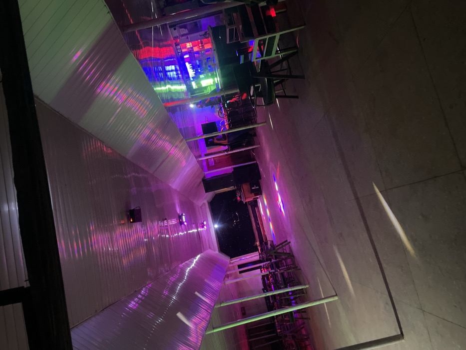 The photo captures the inside of a long, narrow building with white corrugated walls and a dark floor. Tables and chairs line the right side, illuminated by colorful lights shining from above. The lighting creates a tunnel effect, with brighter colors at the far end drawing the eye inward. The overall scene appears to be an entertainment venue, possibly a bar or club, with a vibrant and dynamic atmosphere.