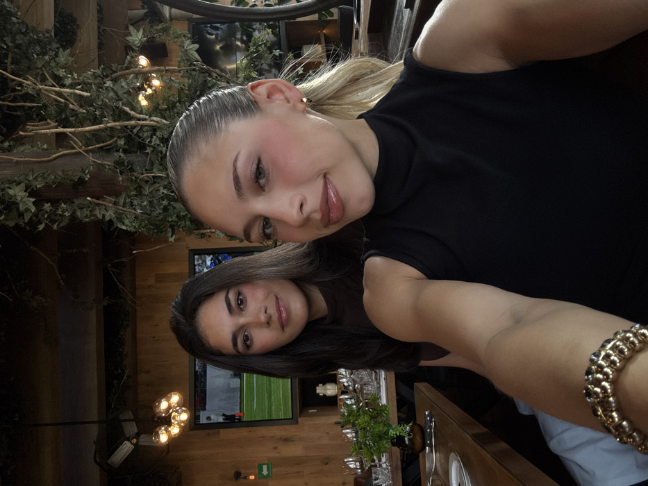 Two young women pose for a selfie indoors. One has blonde hair pulled back in a ponytail and wears a black top. The other has long, dark brown hair. Both women face the camera with soft smiles. The setting appears to be a restaurant or bar, with wood paneling and dim lighting. A television screen displays a football game in the background. A gold bracelet is visible on one woman's wrist. Greenery and string lights decorate the space.