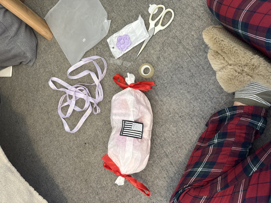 An indoor scene, likely a private residence in Be'er-Sheva, Israel, displays a person's lower extremities positioned on a light gray, textured carpet or rug. The individual is wearing red, green, and black plaid pants, a striped sock on the left foot, and a tan furry slipper on the right foot. Central to the composition is an item wrapped in translucent white tissue paper, shaped like a large candy, secured at both ends with red ribbons. Affixed to this wrapped item is a black-and-white label featuring a distressed American flag design and text that includes "BEA" and "COLLECTION." Scattered around the wrapped item are a long, light purple ribbon with repeating gold text, a crinkled transparent plastic bag marked with "XS," a pair of white-handled scissors with silver blades, a clear roll of adhesive tape, and a small transparent plastic bag containing a purple, flower-shaped object. The arrangement suggests an ongoing gift-wrapping or unwrapping activity.
