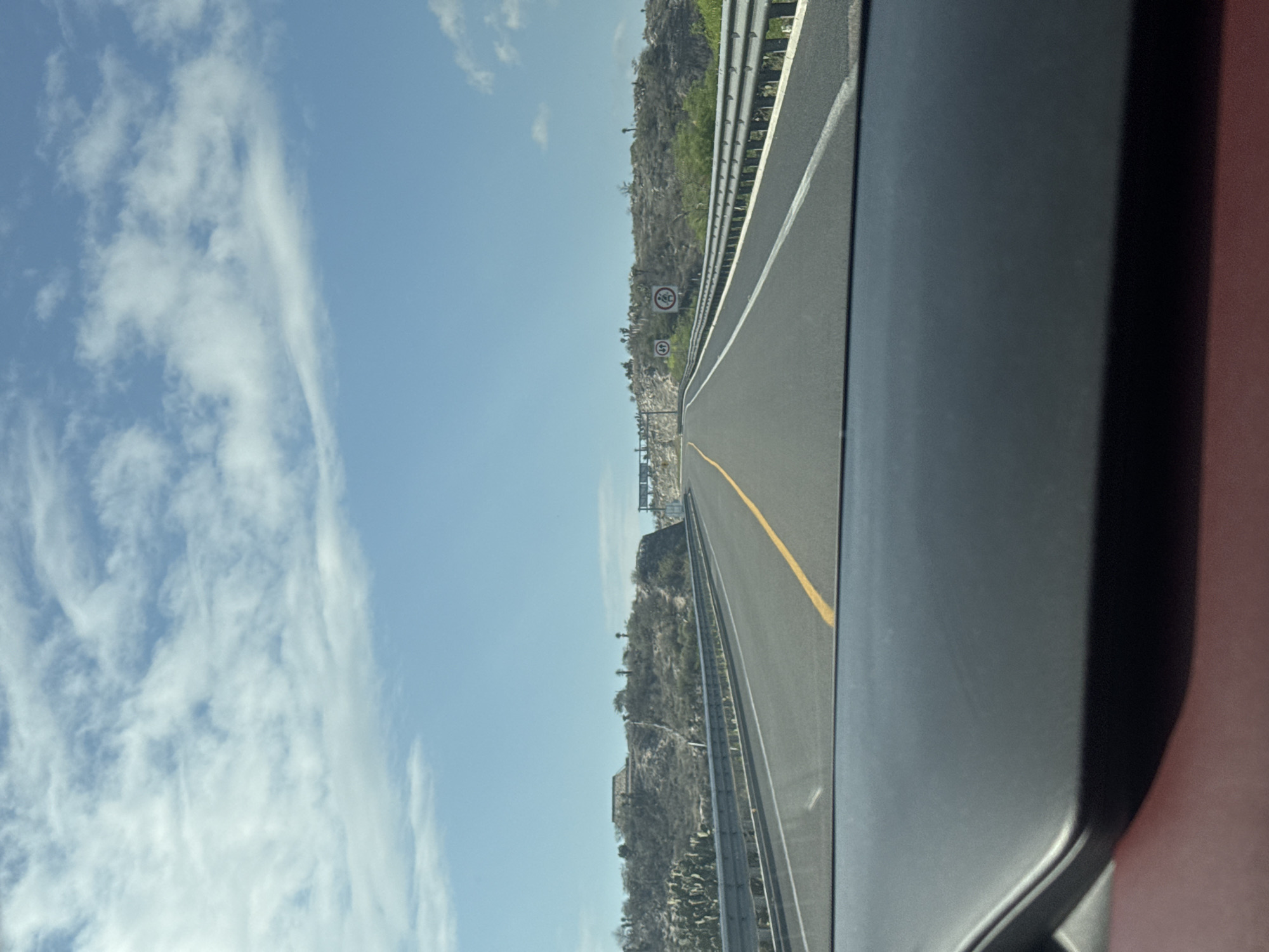 The image depicts a straight stretch of a two-lane paved highway, viewed from the interior of a vehicle, in what appears to be an arid or semi-arid region near Tehuacán, Mexico. The road features a solid yellow center line and solid white lines on the shoulders, flanked by silver metal guardrails on both sides. The surrounding landscape consists of rocky hills covered with sparse vegetation, including numerous columnar cacti and scrub brush. In the distance, on the left hilltop, a building with a triangular roof is visible. Further along the road, multiple traffic signs are present: one circular sign displays "60" within a red circle and a diagonal line, and another circular sign shows a stylized figure of a person with a diagonal line. The sky above is clear blue with scattered white cumulus and cirrus clouds. The bottom portion of the image reveals the dark grey dashboard and a reddish-brown interior trim of the vehicle from which the photograph was taken. No individuals are visible in the scene.