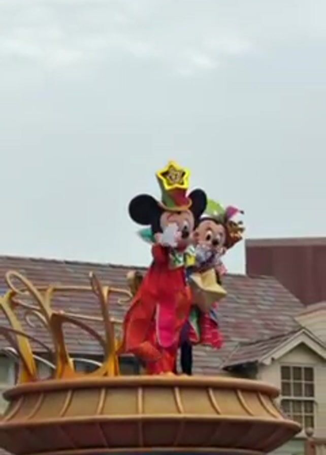 - "Mickey and Minnie Mouse stand on a gold-colored float against a pale sky" by FM-J9Tlk2, licensed under CC BY 4.0