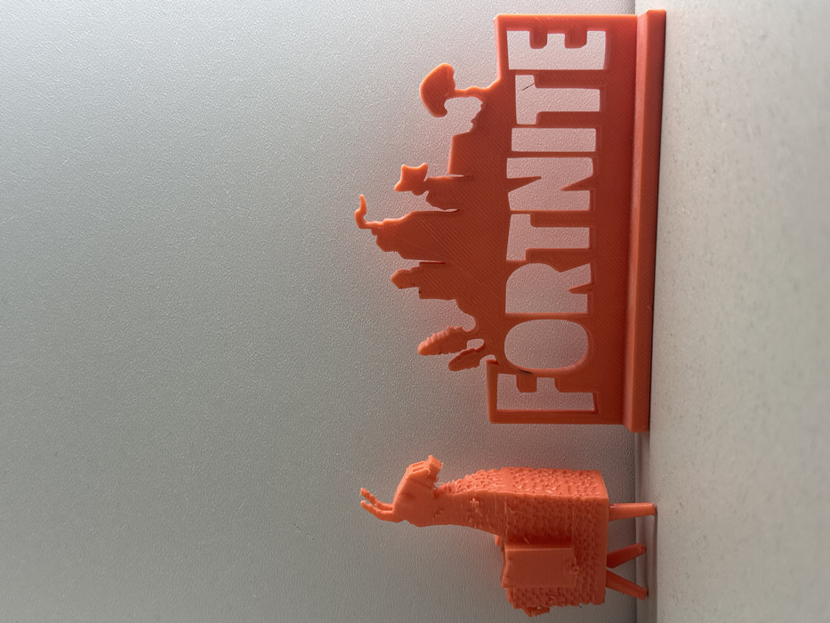 The image displays two orange 3D-printed objects resting on a light-colored flat surface, against a plain, light gray background. On the left, a textured figurine of a llama stands upright, exhibiting visible horizontal layer lines from its 3D printing. To its right, a larger, rectangular 3D-printed stand features the word "FORTNITE" in capital letters cut out from its lower section. Above the "FORTNITE" text, the stand incorporates a silhouette design depicting various stylized structures, including castles, towers, and trees. This object also displays visible 3D printer layer lines. The scene is illuminated from the upper left, casting subtle shadows behind the objects. No people are visible. The scene is located in Sofia, Bulgaria.