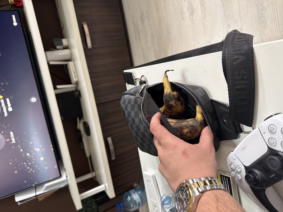 The scene depicts an interior setting, identified as a location within the city of Blagoevgrad, Bulgaria. A light-colored rectangular table occupies the foreground. On this table, a person's right hand, wearing a two-tone (gold and silver) wristwatch, is observed reaching into an open black shoulder bag. The bag features a gray and black checkerboard pattern, consistent with Louis Vuitton Damier Graphite, and its strap bears the embossed "LOUIS VUITTON" logo. Inside the bag, two significantly overripe bananas, exhibiting dark brown and black discoloration, are present. To the immediate left of the hand, a white PlayStation 5 DualSense controller rests on the table. Partially visible behind the controller and to the left of the hand is a pack of cigarettes displaying Cyrillic text. To the right of the shoulder bag, a set of keys with a black fob is visible on the table. In the background, a dark brown media console with a light-colored top shelf is positioned. A large flat-screen television is centered on this shelf, displaying a user interface with options such as "Add User" and a highlighted profile named "Yordan Iliński". To the left of the television, a white vertical PlayStation 5 console stands. Various other electronic devices, including a white vertical modem/router-like unit and a smaller black device, are situated on the shelf to the right of the television. Further to the left in the background, a large plastic water bottle with a blue cap and a dark potted plant are visible. The flooring appears light-colored.