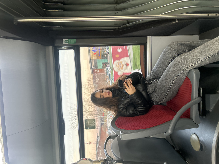 Inside a public transport vehicle, likely a bus, a young woman with long, dark hair is seated, looking intently at a black smartphone held in both hands