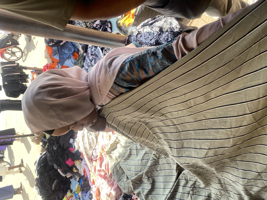 The image depicts an outdoor secondhand clothing market in Sabon Gari South, Nigeria, under bright daylight conditions