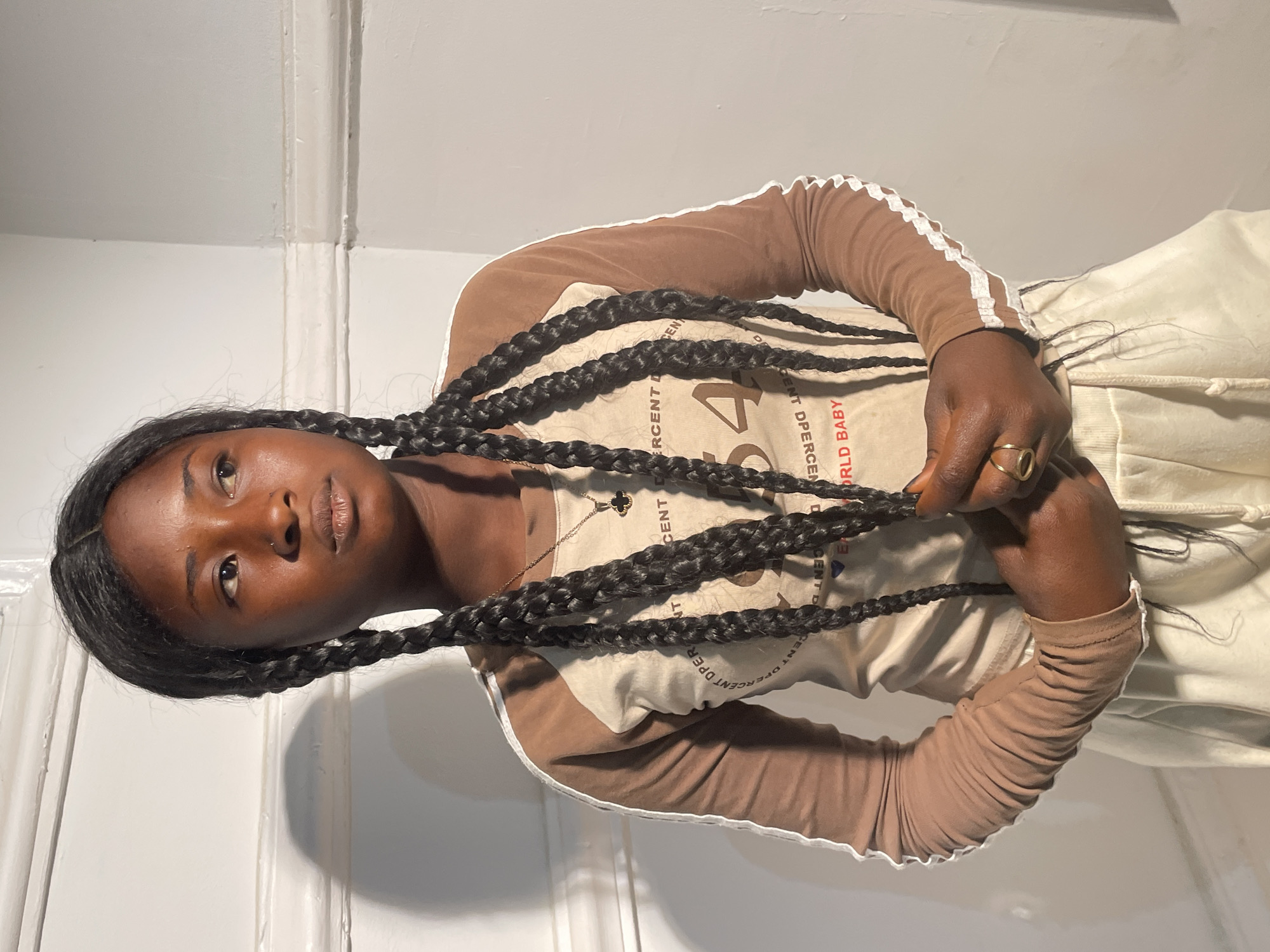 - "A young woman with dark skin and long, black box braids is depicted in a standing portrait, presumably indoors in Barakin Akawo, Nigeria" by FM-PjuW22, licensed under CC BY 4.0