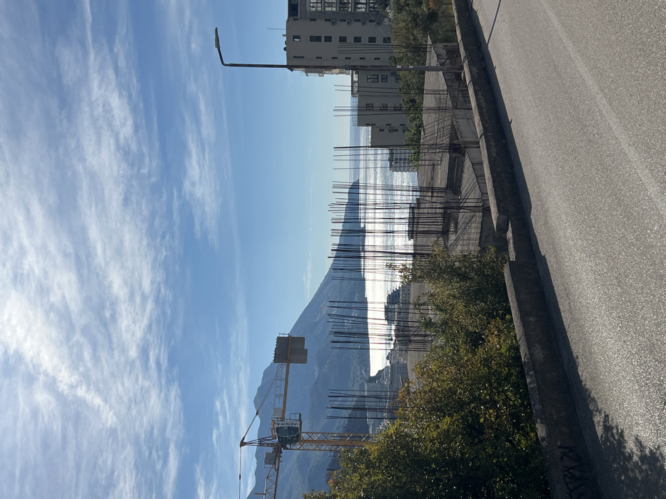 A coastal cityscape features an unfinished building site with protruding rebar and a yellow construction crane. Beyond the construction, the sparkling sea meets a distant mountain range under a blue sky streaked with clouds. To the right, a tall building and a street lamp stand adjacent to the road in the foreground. Green foliage partially obscures the construction site. A concrete barrier lines the roadside, casting a shadow onto the asphalt.