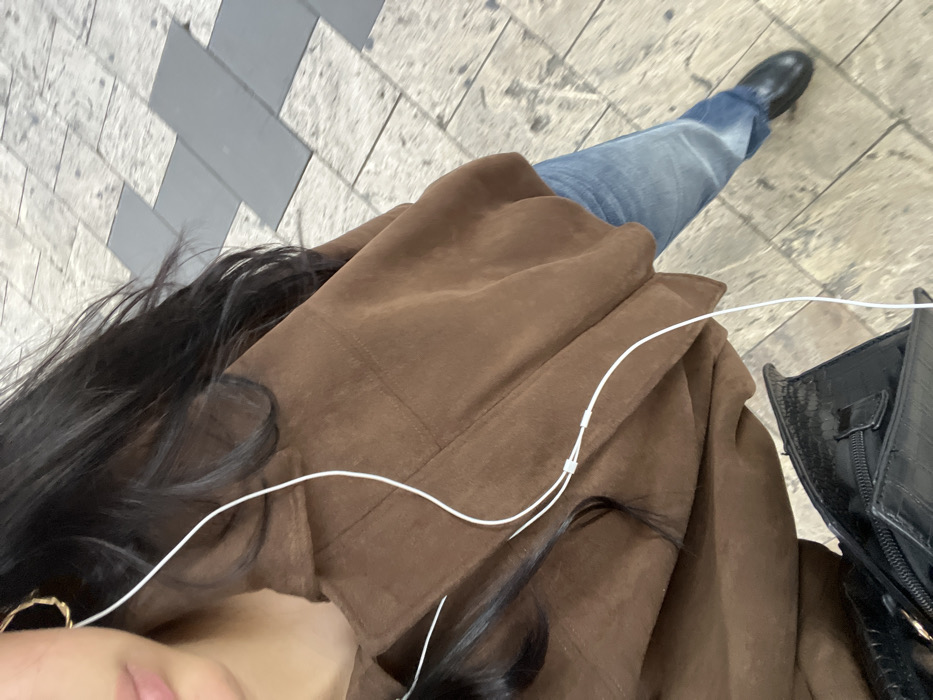 A close-up, downward-angle photograph depicts a female subject from the mid-chest to the feet. The subject has long dark hair, a visible left ear adorned with a gold-colored hoop earring, and light-colored lips. She is dressed in a brown, oversized, collared garment, light blue denim jeans, and a black shoe on her right foot. White wired earbuds are draped across her brown top, with one earpiece visible near her left ear. A black, crocodile-textured handbag with an open zipper is positioned on her left side. The subject stands on a tiled floor exhibiting a distinctive geometric pattern of light-colored and dark grey/black rectangular tiles. This flooring pattern identifies the location as within the Tbilisi Metro system in Tbilisi, Georgia.