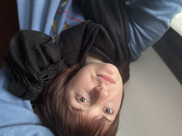 A woman with light skin, brown hair, and brown eyes looks into the camera. A black scarf is draped around her neck and chest. She is wearing a blue sweater with a gold and red design. She appears to be lying down, with a blue blanket or sheet beneath her. A white wall and a dark window frame are in the background.