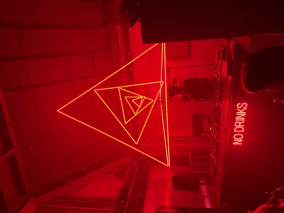 This image depicts an indoor event space, likely a club or performance venue, located within the city of Los Angeles, United States of America. The precise venue cannot be determined from the visual evidence. The environment is illuminated predominantly by a strong red ambient light. Suspended from the vaulted ceiling, which features exposed structural beams, is a large, illuminated art installation composed of concentric, interconnected triangles rendered in bright yellow-orange neon-like tubing. At the center, a male individual is positioned behind a console, largely silhouetted by the red lighting. He wears a dark cap and a dark shirt, and is holding a microphone to his mouth, indicating a vocal performance or address. The console in front of him contains multiple pieces of electronic equipment, consistent with DJ or audio mixing setups, including what appear to be turntables or media players and a mixer. The front face of this console features illuminated red text spelling "NO DRINKS". A tall, dark speaker is present on the immediate right of the console, with a smaller, dark speaker visible to the far left. The heads and upper torsos of two individuals, presumed audience members, are partially visible in the lower foreground, facing towards the console area.