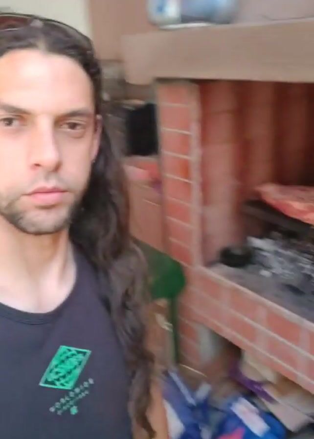 A man with long dark hair and a beard is recording a video of himself standing in front of a brick grill