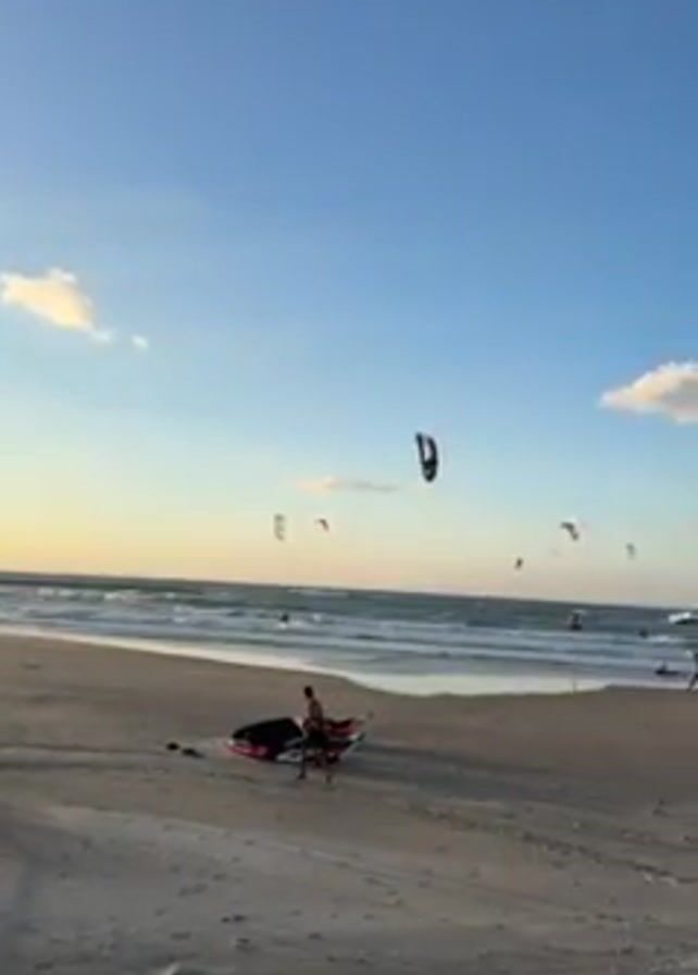 beach on a sunny day with a mostly clear blue sky. In the distance, several kites are flying over the ocean, likely used for kitesurfing or similar water sports. People are visible on the beach and in the water, some appearing to be preparing equipment or walking towards the water. A person is walking along the beach carrying a kiteboarding board. Various kitesurfing equipment such as kites and boards are lying on the sand. A red metal fence is visible at the lower-left corner of the frame.