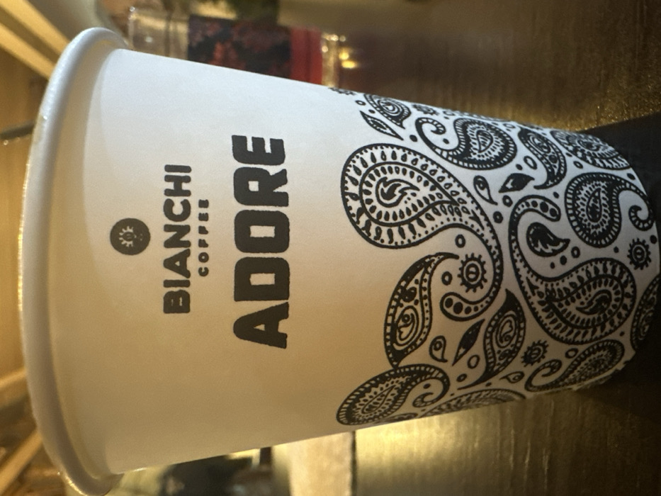 A white disposable coffee cup, branded with "BIANCHI COFFEE" and "ADORE" in black text, along with a black paisley pattern on its lower half, is positioned on a dark, reflective table surface
