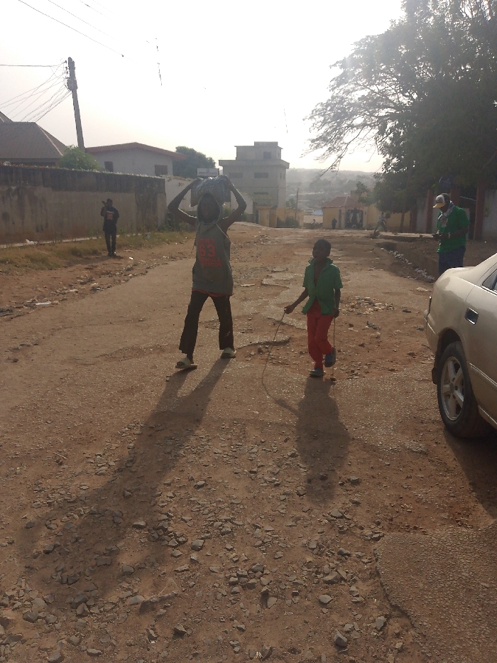 The image captures a sunlit, unpaved road in Jos, Nigeria