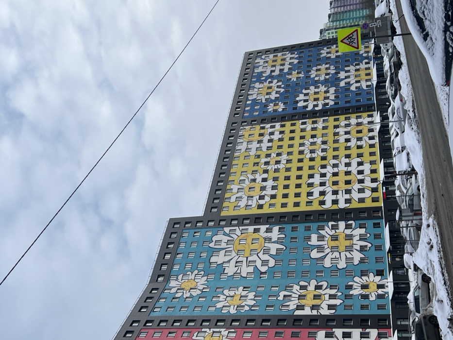 The image displays a multi-story residential building in Murino, Russia, under an overcast sky. The building's facade is characterized by large, stylized white daisy patterns with yellow centers, set against vertically segmented backgrounds of pink, light blue, yellow, and dark blue. Numerous uniform windows are visible across the facade. The building's uppermost section is dark grey. At ground level, commercial storefronts are present. The immediate foreground features a street and a parking area heavily covered in snow. Multiple parked vehicles, many with snow accumulation, line the street and fill the lot. A yellow diamond-shaped road sign depicting two walking children (a pedestrian crossing or school zone warning) stands to the right of the street. A dark overhead power line traverses the upper sky diagonally. In the distant background to the right, additional multi-colored residential buildings are visible. No individuals are clearly discernible.