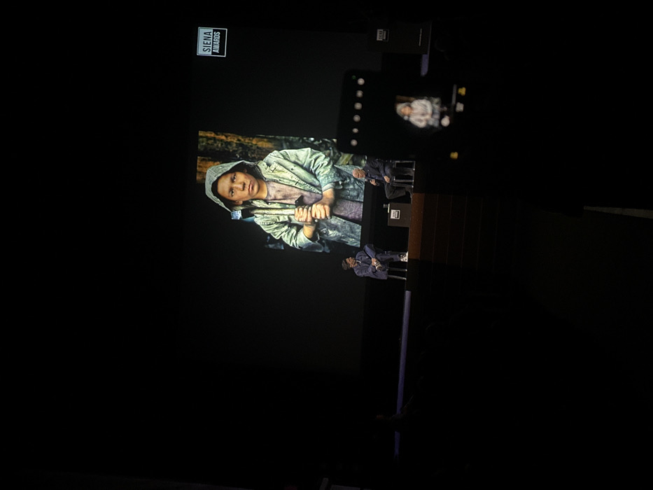 The image depicts an event occurring in a dimly lit auditorium or conference hall, likely in Siena, Italy, as indicated by the "Siena Awards" branding. A large projection screen dominates the background, displaying a color photograph of a young person, possibly a boy, wearing a light-colored, worn hooded jacket and a dark undershirt. This individual holds a thick, light-colored stick or tool handle with both hands, looking directly forward with a serious expression. The photograph's background shows elements of a natural, possibly wooded, environment. The "Siena Awards" logo is present in the upper right corner of the projected image and on a stand positioned on the stage. On a raised stage below the screen, two men are seated in chairs, engaged in an apparent discussion or interview. The man on the left, appearing younger, wears a dark jacket, light shirt, dark trousers, and white sneakers, with his legs crossed. He is oriented towards the man on the right. The man on the right, appearing older, wears a dark suit and is seated with both feet on the floor, facing the first man. A small dark object, possibly a table or podium, stands between them. The foreground is dark, showing blurred silhouettes of audience members. On the right side, a person in the audience holds a smartphone, its screen displaying a blurred reflection of the projected image of the boy, indicating recording or photography of the event.