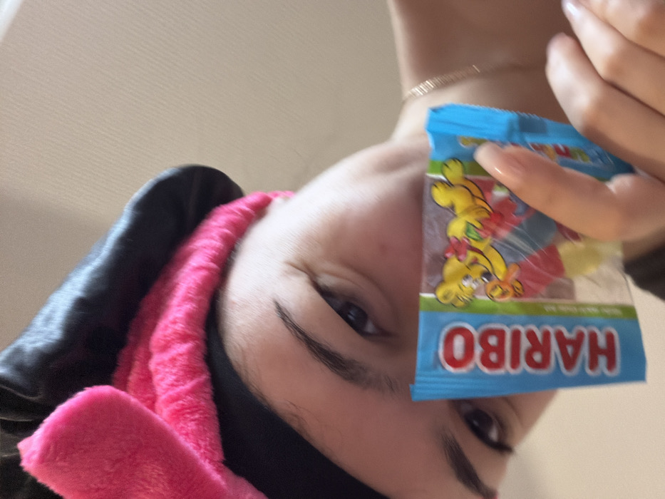 A close-up, portrait-oriented image depicts the upper portion of a person's head and torso, captured at an upward angle. The individual, identified as being in Bouxwiller, France, wears a black satin bonnet underneath a vibrant pink, fuzzy headband. Their dark eyebrows and eyes are visible, with a slight crinkle near the left eye. The lower half of the face is obscured by a small, light blue HARIBO brand gummy bear candy package, held by the person's right hand. The package displays "HARIBO" vertically in white and red lettering, alongside images of yellow gummy bears and assorted red and yellow gummy candies. The person's fingers, with light-colored fingernail polish, grip the package. A thin, gold-colored chain necklace is visible on the right side of their neck, above a dark garment. The background is an out-of-focus, solid light beige or off-white surface, consistent with an interior wall.