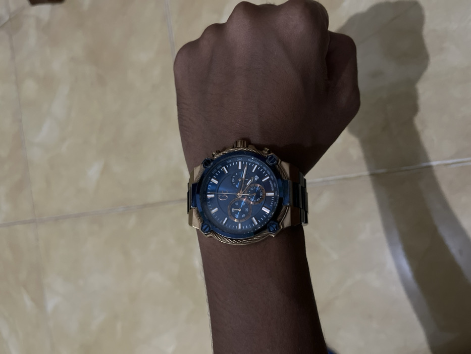 This image depicts a close-up of a human left arm and hand wearing a wristwatch, located in Pulorayeuk, Indonesia. The arm, exhibiting medium-dark skin pigmentation, extends from the lower left towards the right, terminating in a loosely clenched fist. A large, round, Gc brand chronograph wristwatch is prominently displayed on the wrist. The watch features a dark blue dial with rose gold-tone hour markers, hands, and subdial accents, alongside three subdials and a date indicator. Its robust case is predominantly rose gold-toned, with discernible cable-textured bezel elements and blue accents on the crown and two pushers. The watch is secured by a metallic link bracelet, appearing to be a two-tone design integrating rose gold and dark blue or black segments. The background consists of a clean, tiled floor with light beige or cream-colored square tiles separated by dark grout lines. Overhead lighting casts a distinct shadow of the arm and watch onto the lower right portion of the tiled surface.