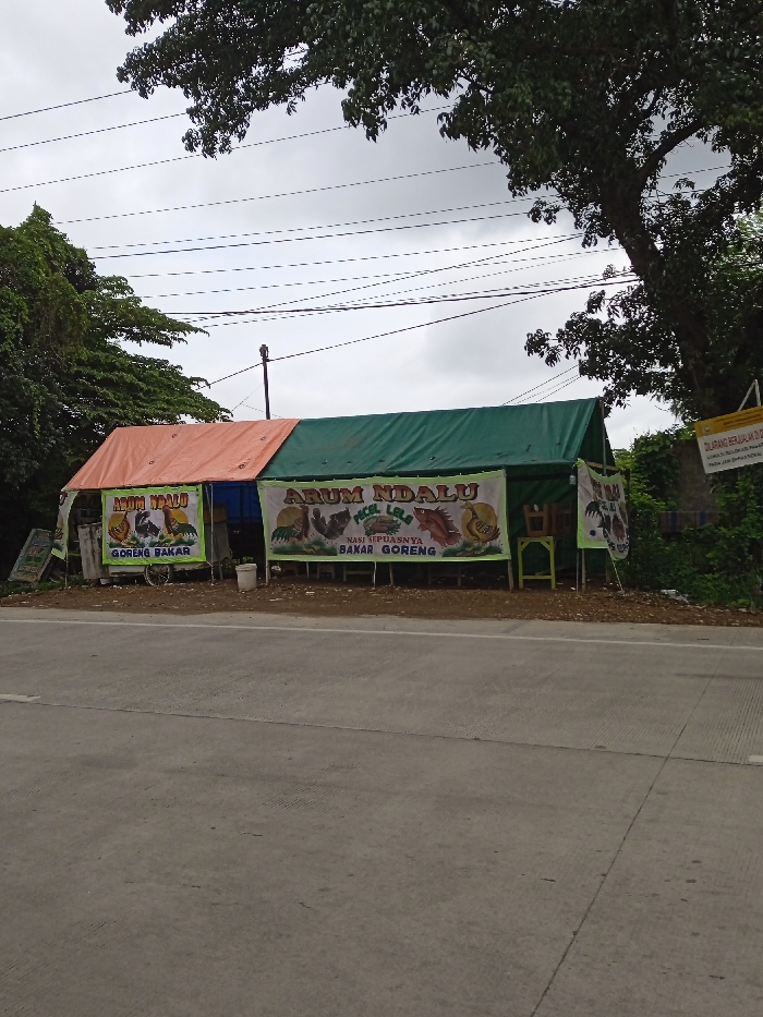 A roadside food stall, named "Arum Ndalu," is set up with orange and green tarps