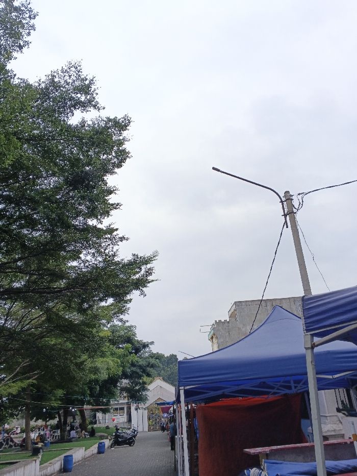 An outdoor scene captured under an overcast sky in Ho Chi Minh City, Vietnam, specifically near the Youth Cultural House in District 1. The image presents a mixed-use public space featuring both green areas and temporary market stalls. On the left side, a large, dense-canopied tree dominates the upper frame, extending downward. Below it, a grassy park area contains multiple small groups of individuals sitting on the ground or low benches, engaged in social interactions. A paved walkway separates this green space from the foreground. Two blue cylindrical bins are visible along the edge of the walkway. A black scooter or motorcycle is parked on the paved area further down the path. The right side of the image features a row of blue canopy tents, indicative of market stalls. The closest tent has a red fabric panel hanging as a partial wall. Behind these tents, a concrete utility pole with an attached street light arm and multiple black electrical wires stands prominently. In the mid-background, a multi-story building with a weathered, possibly concrete facade is visible. The overall environment suggests a public gathering or temporary market event in an urban park setting.