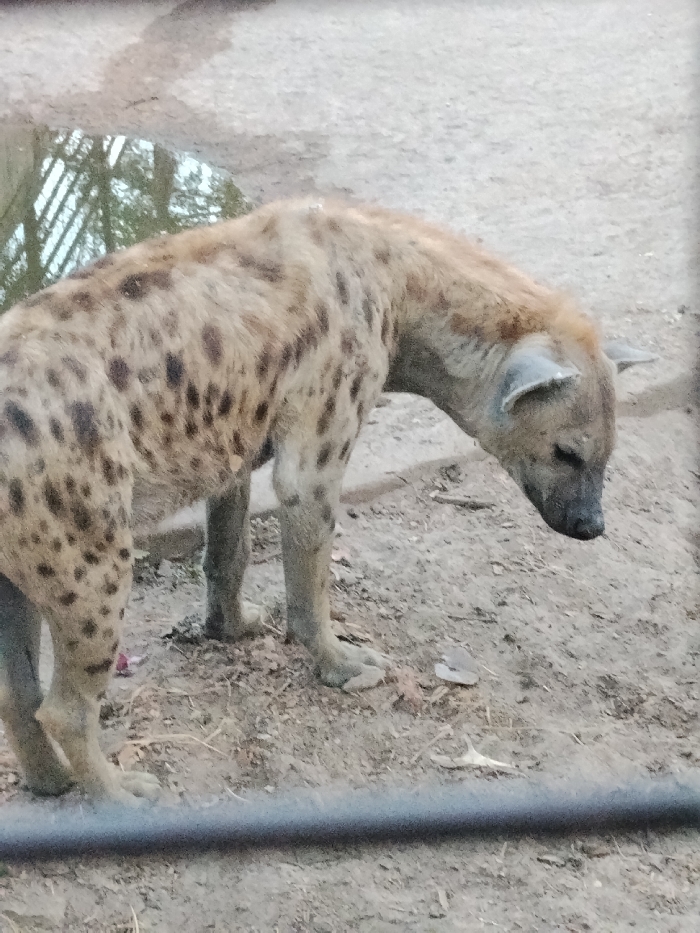 The image displays a spotted hyena (Crocuta crocuta) positioned on dry, light brown earth in Garun Gawa, Nigeria. The animal's body is oriented generally to the left, while its head is lowered, looking downwards and slightly to the right of the frame. Its coat is light brown with prominent dark brown spots. The hyena's ears are visibly gray and rounded. The ground beneath the animal is characterized by loose soil, small debris, and darker patches of dirt. In the upper left quadrant, a reflection in a water puddle shows indistinct vertical structures, possibly bars of an enclosure, along with blurred natural elements. A dark, horizontal bar spans the lower foreground, partially obscuring the hyena's lower limbs and the immediate ground.