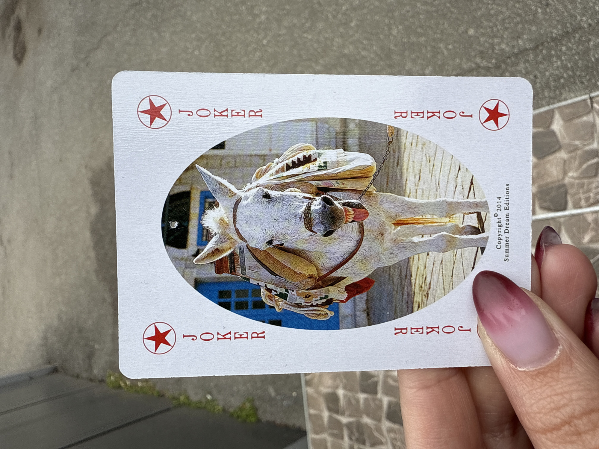 playing card, specifically a Joker, being held in someone's hand. The card features a photograph of a white donkey, saddled and decorated with what appears to be traditional Bulgarian attire. The donkey is positioned against a backdrop of a building with blue window frames. "JOKER" is printed in red lettering at each corner of the card, along with a red star. On the right side of the card, "Copyright 2014 Summer Dream Editions" is printed. The hand holding the card has long nails painted with a pink and maroon ombre design. The background of the photo shows a gray pavement and a stone wall, suggesting an outdoor setting. It appears the Joker card depicts a donkey from Sofia, Bulgaria.