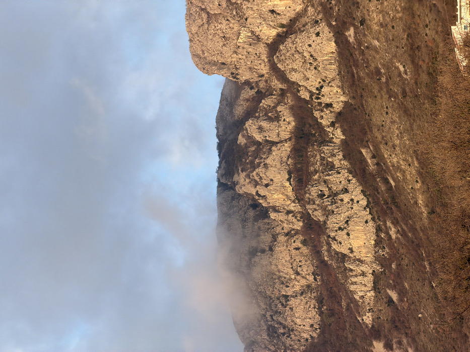 The image displays a rugged mountainous landscape in Drobnići, Montenegro, under a partially cloudy sky. The upper third of the frame shows a sky with blue patches, interspersed with white and light grey clouds, some appearing as wisps, others as denser formations, with particularly heavy cloud cover or fog obscuring the upper reaches of the mountains on the left. The central and lower portions of the scene are dominated by a steep, rocky mountain range. On the left side, the mountain peaks are partially enveloped in low-lying fog or cloud, with exposed rock surfaces appearing grey and fragmented. These areas show sparse, dark-colored vegetation, including bare deciduous trees and shrubs, clinging to the crevices. The right side of the mountain range features a prominent, sheer rock face illuminated by direct sunlight, exhibiting warm golden-brown and ochre tones. This section reveals distinct vertical and horizontal geological striations and deep shadows that highlight the rock's texture and contours. The lower slopes extending into the foreground are covered with dense, brown and reddish-brown scrub, bare bushes, and dormant vegetation. Interspersed within this growth are patches of exposed light grey rock and scree. In the extreme bottom-right corner, a small, partial white structure with an orange roof is visible, indicating human habitation at the base of the mountain. No human figures, animals, or active interactions are present within the frame.