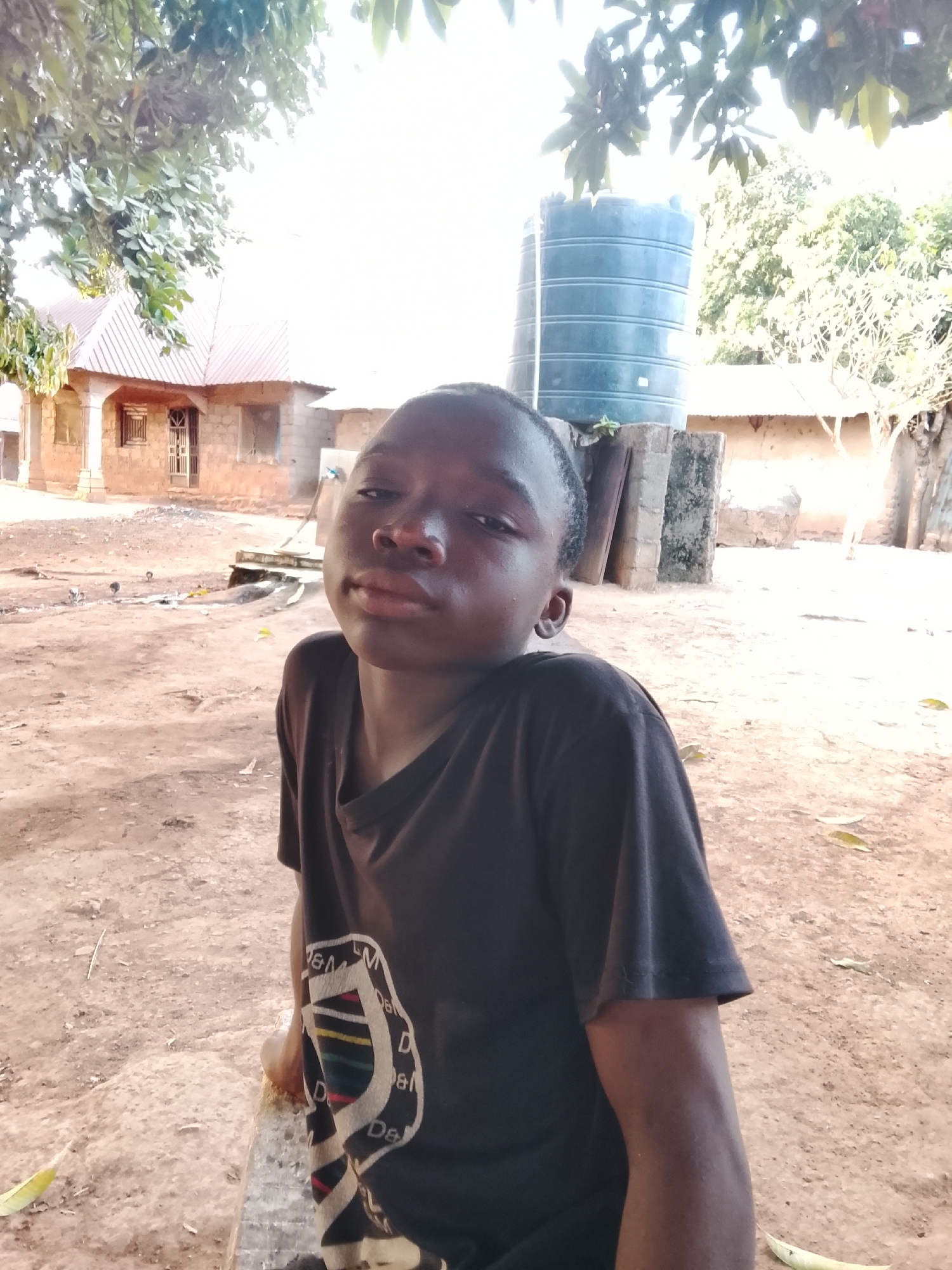 A portrait shot of a young Black male is taken outdoors during daylight. He is wearing a dark, short-sleeved t-shirt and sitting on what appears to be a cement or stone structure. The background features a dirt ground and several buildings of varying sizes, suggesting a rural or less developed area. A large, dark green water tank is also visible behind him. The location is in a city, but the city is Unknown.