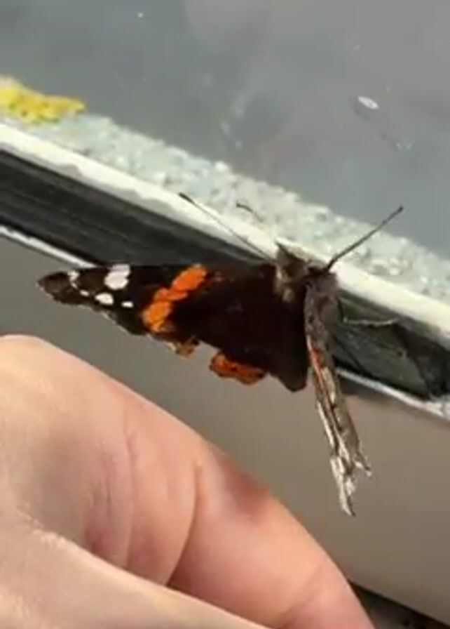 A close-up video shows a person's hand holding a butterfly with damaged wings