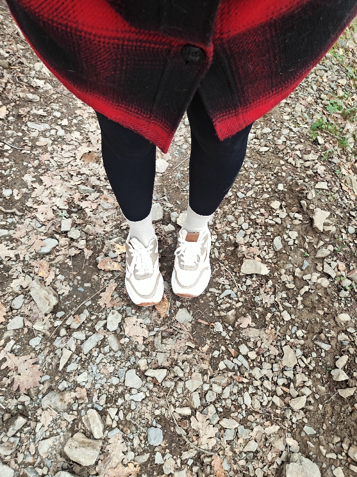 The image depicts the lower body of an individual standing on an unpaved surface in Partenit, Ukraine. The person wears a red and black plaid jacket or coat, black leggings, light-colored ankle socks, and white sneakers with tan accents and brown soles. The ground beneath the individual is a mixture of small, grey and brown gravel, scattered dry brown leaves, and dark soil. Sparse green vegetation is visible along the right edge of the frame. No specific actions or interactions are depicted beyond the individual standing upright.