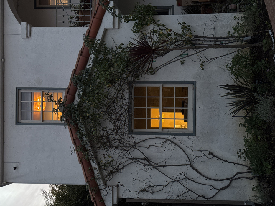 A two-story white building features two visible windows. The left window glows with a warm, yellow light revealing a chandelier inside. A vine with sparse leaves creeps along the textured stucco wall, partly obscuring the right window. The light emanating from the right window is also yellow, though less defined. A terracotta-tiled roof extends between the windows. Shrubs and other greenery surround the lower right corner of the building. The sky is overcast.