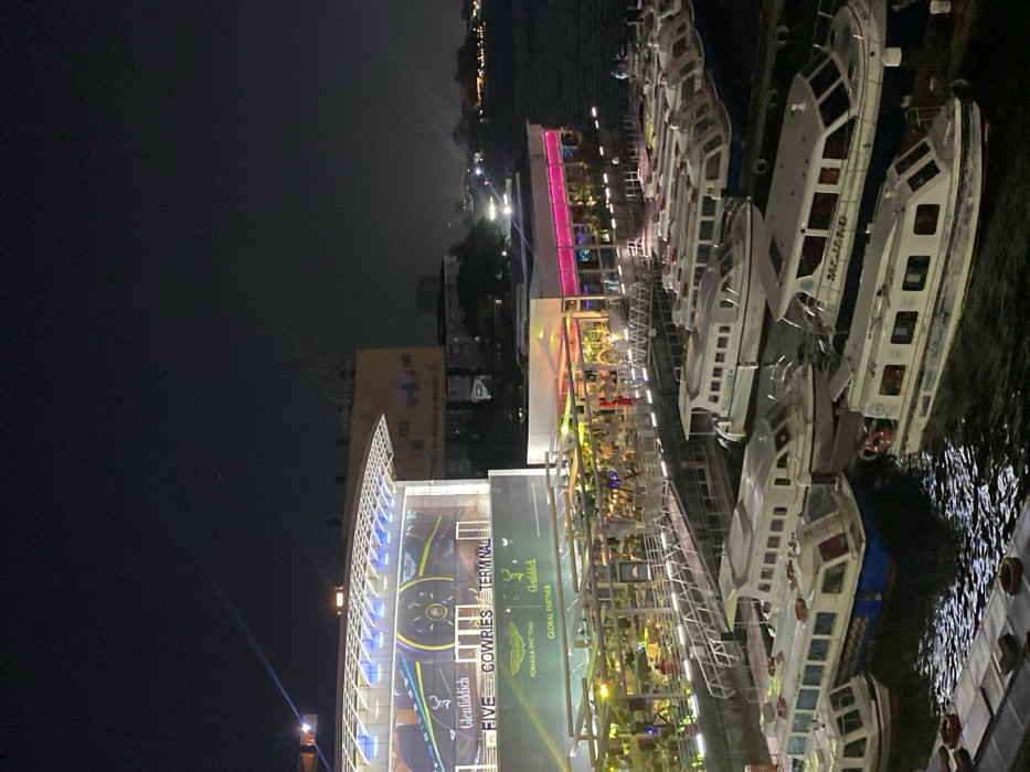 At night, a series of white boats are docked along a pier illuminated by bright lights. The pier is flanked by a modern, multi-story building prominently featuring the words "FIVE COWRIES TERMINAL". Restaurants and seating areas are visible within the structure, indicating a lively atmosphere. A taller building is seen in the background and the horizon is lit by distant city lights. The dark water surrounds the boats, creating a contrast with the pier's vibrant lights.