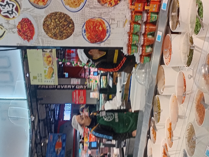 A restaurant or grocery store interior featuring a condiment bar with various ingredients in white containers. A selection of chili oils and sauces are shelved alongside the containers. Customers wearing casual clothing are seen browsing the aisles. The décor includes food images, with the phrase "FRESH EVERY DAY" visible.