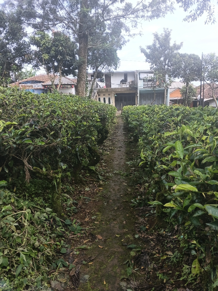 A narrow, unpaved dirt path extends from the foreground into the background, flanked by uniform rows of dense green bushes resembling tea plants. The path appears damp and is sparsely covered with fallen leaves and small vegetation. In the midground, the cultivated bushes form a clear corridor leading towards residential structures. In the background, a light-colored, two-story building with a ground-level entrance and an upper balcony with hanging laundry is prominently visible. To its left, a building with a red-tiled roof is partially obscured by trees, while other residential roofs and dense foliage are present in the distance under an overcast sky. No individuals are present within the scene. This scene is located in Unknown, Uruguay.
