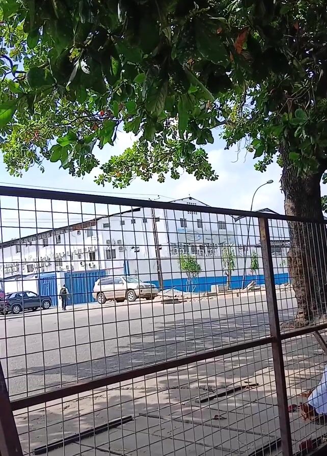 view through a metal wire fence, partially obscured by the overhanging branches and leaves of a tree. Beyond the fence is a street with vehicles parked and moving. A white and blue multi-story building is visible in the background. A person is walking on the sidewalk in front of the building. A pink semi-truck with a trailer passes by on the street. The sky is blue with some white clouds. The day appears to be sunny. A shadow is cast on the sidewalk in the foreground.