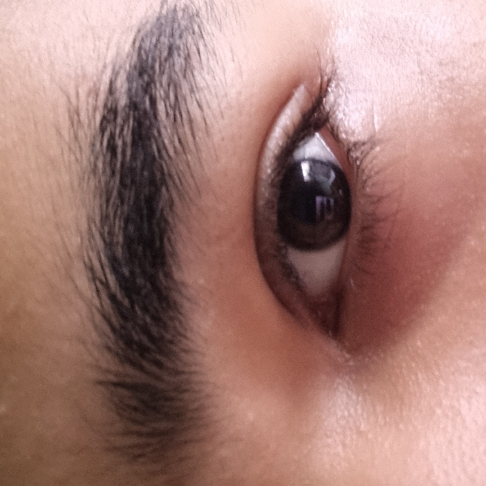 The image presents a close-up, forensic-style view of a human left eye and its surrounding features. The eye has a dark brown iris with a distinctly visible pupil, which reflects a bright, rectangular light source, likely a digital screen or window. Dark, short eyelashes line both the upper and lower eyelids. Above the eye, a thick, dark eyebrow is visible, composed of individual hairs. The skin around the eye and eyebrow appears light to medium in tone, showing minor textural details. No specific action, interaction, or broader environmental context is discernible beyond the subject's face. The image contains no visual data to identify a specific location within the city of Sepang, Malaysia.