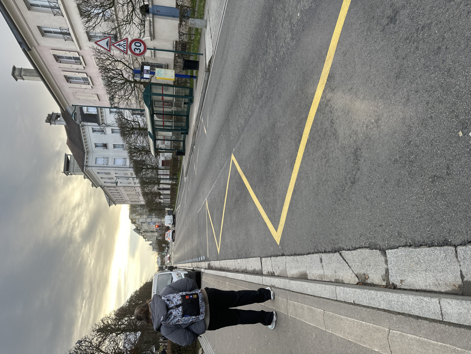 This image depicts a street scene in Serris, France, under an overcast sky. In the foreground, a person stands on a light-colored concrete sidewalk, with their back to the viewer. They are wearing a grey puffer jacket, dark trousers, light-colored sneakers, and a distinctive multi-colored backpack. A grey granite curb separates the sidewalk from a dark asphalt road. Yellow zigzag lines are painted on the asphalt roadway adjacent to the curb, indicating a specific zone. Further down the street on the right, a transparent green and metal bus stop shelter is visible, accompanied by a black trash bin. Immediately to the right of the bus stop, a pole supports three circular road signs: a triangular warning sign for uneven road, a triangular warning sign for a pedestrian crossing, and a regulatory speed limit sign indicating "30" in a red circle. A row of pruned deciduous trees lines the street behind the bus stop, fronting a series of multi-story buildings with light-colored facades, multiple windows (some with shutters), and pitched roofs. In the background, the street extends into the distance, with several vehicles (cars and vans) visible on the road, and a traffic light displaying red.