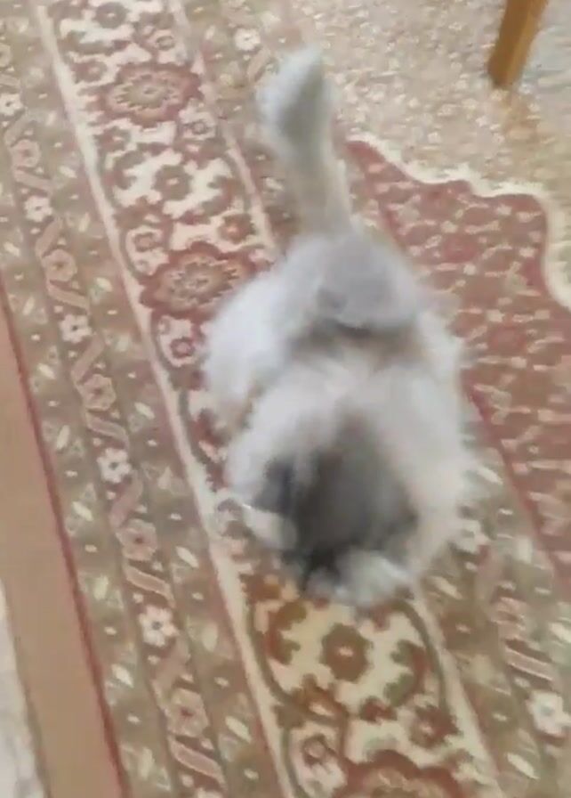 A gray, fluffy kitten is standing on an ornate rug. The camera circles the kitten. The kitten meows. Someone pets the kitten on its back.