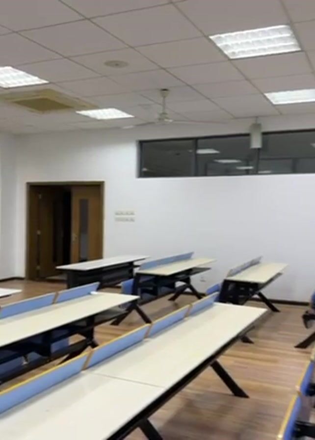 The video depicts a static shot of an empty classroom. It shows rows of desks with blue dividers and black legs. The floor is wooden. The walls are white, and there's a rectangular window near the ceiling on one wall. The ceiling is white with square light fixtures. A ceiling fan is also visible. A door is present on one of the walls. There are no people in the scene.