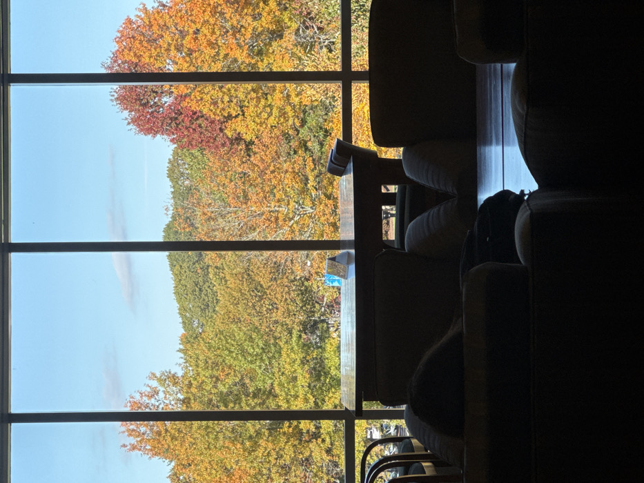 The image displays an indoor scene in Waltham, United States, looking out through a large, multi-paned window. Outside, a dense array of deciduous trees exhibits vibrant autumn foliage, with dominant colors of red, orange, yellow, and green. A clear blue sky with sparse white clouds is visible above the tree line. The window itself is framed by dark vertical and horizontal mullions. In the midground of the interior, a substantial dark wooden table is positioned directly in front of the window. Two dark chairs are visible on the far side of this table, facing inward. On the table's surface, a small, light-colored triangular object with a pattern and a blue container are discernible. The immediate foreground features dark, upholstered armchairs, rendered largely in silhouette due to backlighting from the window. The top of a person's head and shoulders, also in silhouette, are visible above the back of an armchair on the left side of the foreground, suggesting they are seated and facing generally towards the window. A dark bag rests beside this individual, on or near the armchair. Another similar armchair is positioned to the right in the foreground. No discernible interactions or specific actions are occurring beyond the person being seated.