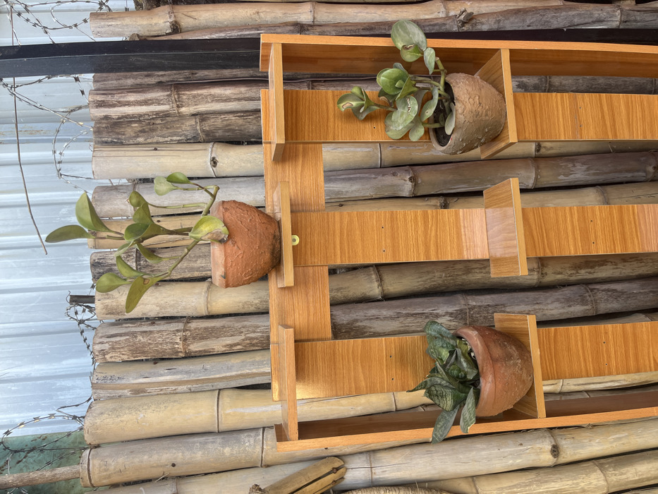 This image, captured in Bar Jirgi Summa, Nigeria, depicts an outdoor scene featuring a multi-tiered wooden plant stand against a bamboo fence