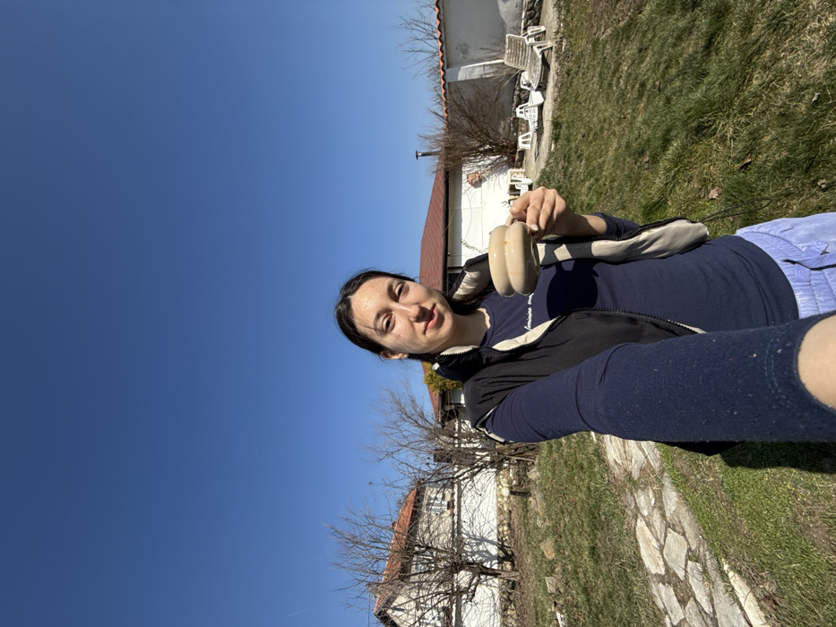 woman taking a selfie outdoors in Galabovtsi, Bulgaria, under a clear, cloudless blue sky. She has dark hair and is wearing a navy blue long-sleeved shirt, a black and beige puffer vest, and light blue trousers. In her right hand, extended towards the camera, she holds a light-beige mug with a distinct ribbed or stacked handle. The woman is positioned on a grassy slope with some bare patches. To her left, a stone pathway made of irregular light-colored slabs is visible. In the background, two white stucco houses with reddish-brown tiled roofs are present. Bare deciduous trees and shrubs stand between and around the houses. To the right of the woman, several white plastic lounge chairs are scattered on the grass near a low white wall.